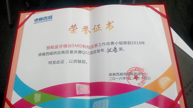日前,我司再傳喜訊,慧翰藍牙模塊SMD制程改善工作改善小組榮獲2016年德賽西威供應商質(zhì)量改善QCC項目發(fā)布會優(yōu)秀獎。